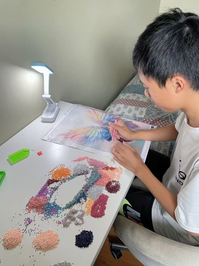 钻石画是一种创意手工,把一颗颗小小的、闪闪发亮的“钻石”贴到画布上,慢慢拼出一幅漂亮的图画。就像马赛克一样,每颗小钻石都很重要,拼在一起就能变成魔法般的作品。对 WK来说,这不仅是个爱好,每完成一幅作品,他都会觉得特别自豪和开心。